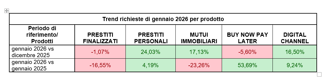 La domanda di prestiti personali ha registrato un notevole aumento del +24% a gennaio rispetto al mese precedente e del +4,3% rispetto a gennaio 2025. L’importo medio di questi prestiti ha raggiunto 10.973€, un aumento del +3,0% rispetto a gennaio dello scorso anno, mostrando una crescita costante in valore. Ancora più sorprendente la crescita degli importi per i prestiti finalizzati, pari a 1.921€: un aumento del +36% su base annua, nonostante il numero totale di richieste sia diminuito nello stesso periodo (-16,6%). Ciò suggerisce che i consumatori che cercano finanziamenti per beni specifici puntano ora a beni di valore più elevato. Questo si riflette nelle finalità dei prestiti: le richieste di finanziamento per auto nuove e usate sono cresciute significativamente su base mensile (rispettivamente +22,4% e +14,6%), mentre le richieste di prestito per l’acquisto di telefoni cellulari sono diminuite drasticamente (-31,7%).