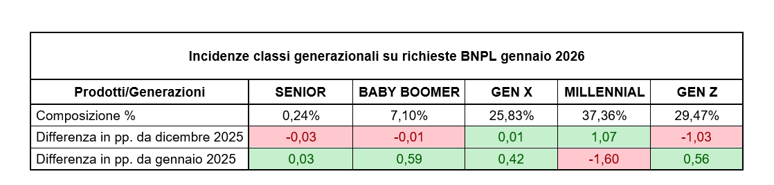 La domanda di soluzioni di credito digital-native continua la sua crescita costante. Nonostante una fisiologica diminuzione del -5,60% da dicembre, complice l’accelerata natalizia di dicembre, le richieste di BNPL sono aumentate del +53,7% rispetto a gennaio dello scorso anno, confermando il suo ruolo di strumento di pagamento chiave. Questa tendenza è guidata in modo preponderante dai consumatori più giovani: Millennials (31-45 anni) e Generazione Z (18-30 anni) insieme costituiscono quasi il 67% dei richiedenti, guidano l’adozione in termini di crescita, con un incremento rispettivamente del +47,4% e del +56,7% su base annua. La crescita è particolarmente pronunciata nel Sud Italia, che ha registrato un aumento del +59,1% su base annua. Nonostante l’importo medio ridotto di questi prestiti, circa 190€, la loro frequenza evidenzia un cambiamento fondamentale nel modo in cui gli italiani approcciano gli acquisti di tutti i giorni. Ciò è ulteriormente supportato dalla crescita mensile del +16,5% delle richieste effettuate tramite canale digitale, che è sempre più il punto di contatto preferito per tutte le interazioni creditizie.