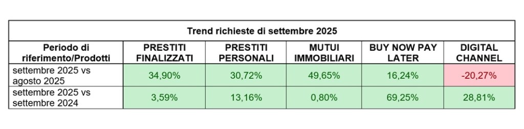 Segno positivo anche per i prestiti personali, in crescita del +13,2% rispetto a settembre 2024. Bene anche i prestiti finalizzati, con un incremento del +3,6% anno su anno. A trainare questo segmento sono soprattutto le richieste di auto nuove, che nel corso del mese hanno rappresentato un quarto delle finalità totali.