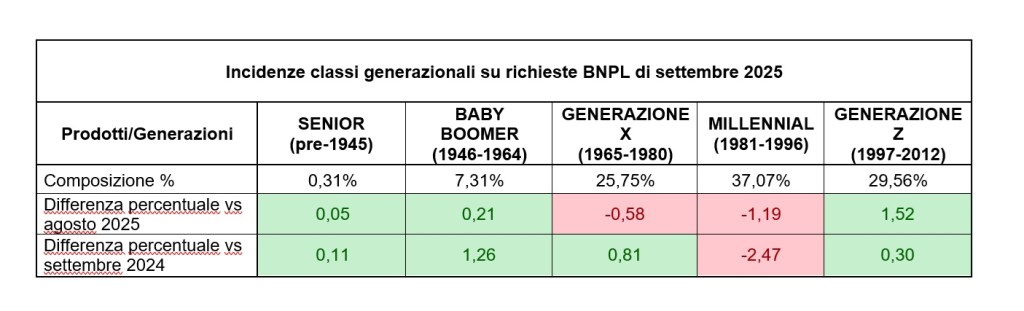 Spicca in particolare l’andamento del Buy Now, Pay Later (BNPL) che continua la sua espansione: negli ultimi 12 mesi, è cresciuto sia il suo utilizzo (+69,25%) che l’importo medio richiesto, che ha raggiunto i 190 € (+25% rispetto a settembre 2024, 152€). Quest’ultimo dato riveste particolare importanza perché indica come il BNPL stia diventando uno strumento di accesso al credito sempre più comune anche per acquisti a maggior valore.