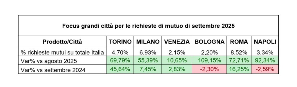 In leggero aumento anche le richieste di mutuo a livello nazionale (+0,8% anno su anno), sulla spinta di una generale tendenza positiva nel Centro-Nord, dove si registra in particolare un exploit della città di Torino, che ha visto le richieste aumentare del +45% da settembre 2024.